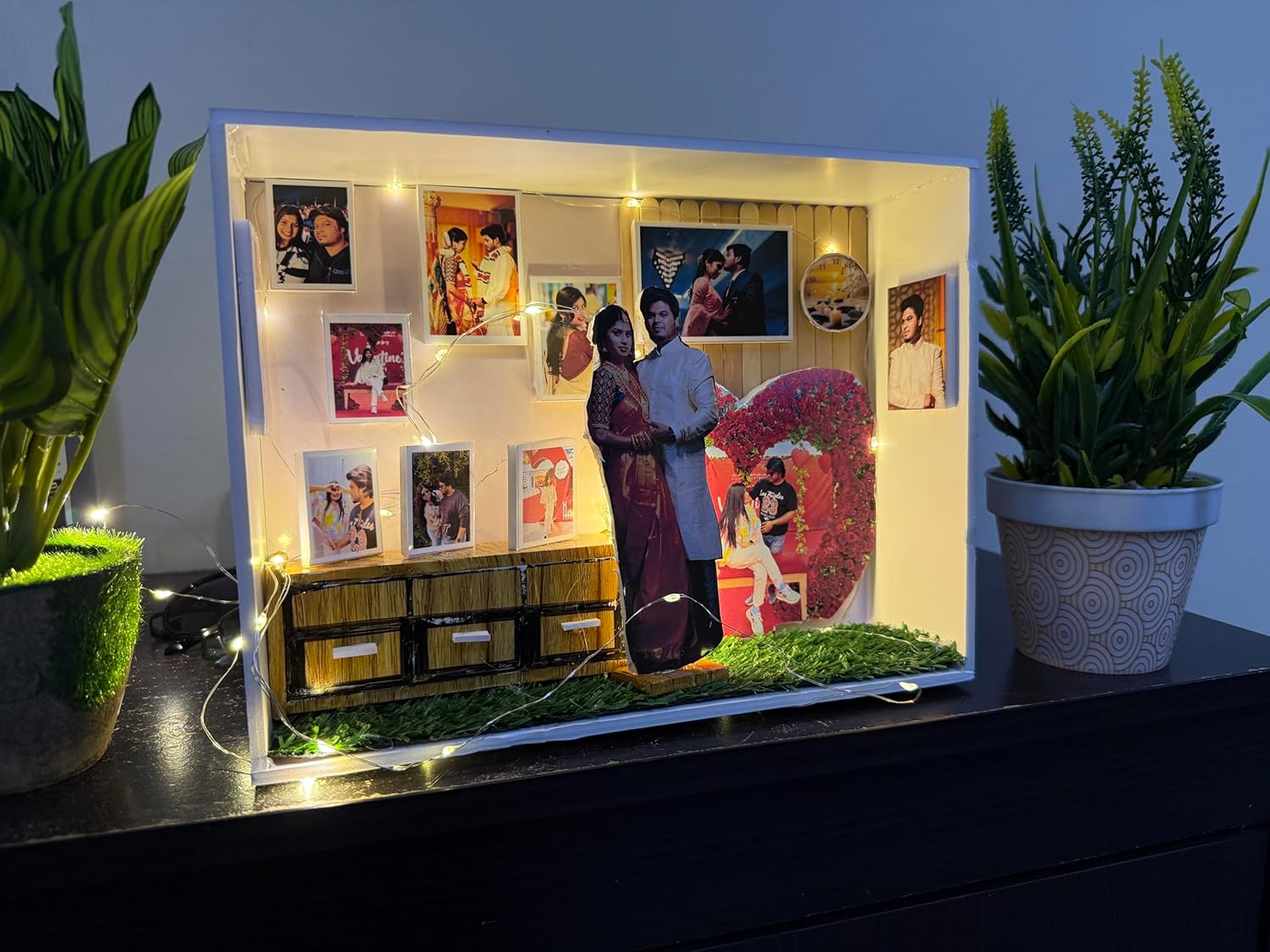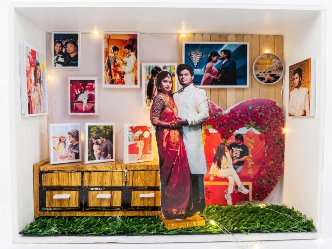 - LAYERED 3D DESIGN: Features a life-size couple cutout, framed wall photos, a miniature wooden dresser, artificial grass flooring, and a decorative heart backdrop for a rich, layered look.