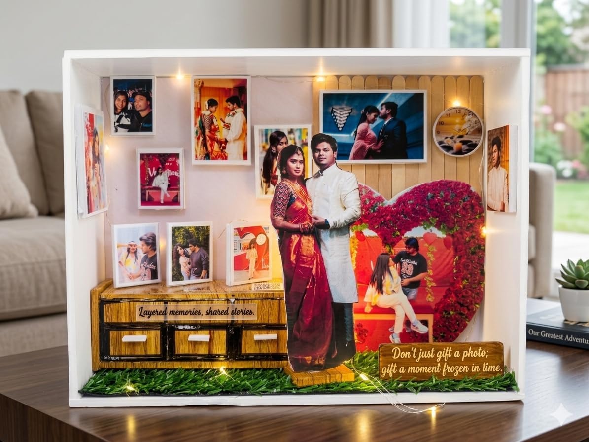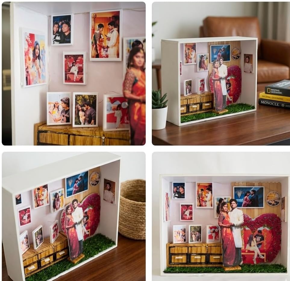 - PERSONALISED MEMORY BOX: A handcrafted shadow box display featuring multiple custom photo prints arranged in a charming miniature room scene.